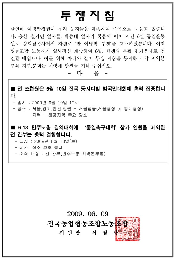 6.10 ¹ü±¹¹Î´ëȸ, 6.13 ¹ÎÁÖ³ëÃÑ °áÀÇ´ëȸ Âü°¡Áöħ