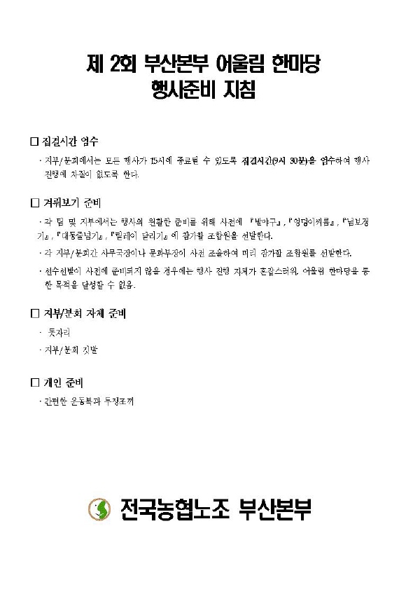 ․°¢ ÆÀ ¹× ÁöºÎ¿¡¼´Â Çà»çÀÇ ¿øÈ°ÇÑ Áغñ¸¦ À§ÇØ »çÀü¿¡ ¡º¹ß¾ß±¸¡»,¡º¾ûµ¢À̾¾¸§¡»,¡º´Ôº¸°æ±â¡»,¡º´ëµ¿Áٳѱ⡻,¡º¸±·¹ÀÌ ´Þ¸®±â¡»¿¡ Âü°¡ÇÒ Á¶ÇÕ¿øÀ» ¼±¹ßÇÑ´Ù.
