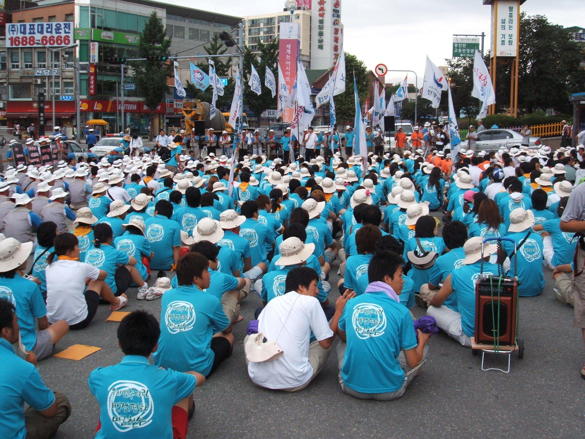 ƯÈ÷ Àü±¹³óÇù³ëÁ¶¿¡¼´Â ¾ÈÀç¼± ±º»ê½Ã ÁöºÎÀå(µÎ¹øÂ° »çÁø ¾ÕÁÙ °¡¿îµ¥)ÀÌ Àü ÀÏÁ¤¿¡ °áÇÕÇϰí ÀÖÀ¸¸ç, ¹ÎÁ·ÀÚÁÖ´ë(Á¦1´ë´ë)Á¦1Áß´ë Áß´ëÀåÀ» ¸Ã°í ÅõÀïÀÇ ¼±ºÀ¿¡¼ ¿Â¸öÀ¸·Î ÅõÀïÇÏ¸ç ¸ð¹üÀ» º¸À̰í ÀÖ´Ù. À§ »çÁøÀº 8¿ù11ÀÏ(¸ñ) µ¿ÀÎõ¿ª¿¡¼ Áýȸ¸¦ °®°í ÀÚÀ¯°ø¿ø¿¡ ÀÖ´Â 'ºÐ´ÜÀÇ ¿øÈä ¸Æ¾Æ´õ À屺 µ¿»ó' ö°Å¸¦ Ã˱¸Çϸç ÇàÁøÇÏ´Â Àå¸éÀÌ´Ù.