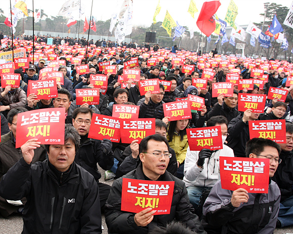 ¹ÎÁÖ³ëÃÑÀÌ ¡®¹Ý³ëµ¿ ¹Ý¹ÎÁÖ ¹Ý¹Î»ý MBÁ¤Ã¥ Æó±â¡¯¸¦ Ã˱¸Çϸç 2010³â ÃÑ·ÂÅõÀïÀ» ¼±Æ÷Çß´Ù. ¹ÎÁÖ³ëÃÑÀº Áö³ 27ÀÏ(Åä) ¿ÀÈÄ3½Ã ¼¿ï ¿©Àǵµ ¹®È¸¶´ç¿¡¼ ¡®±¸Á¶Á¶Á¤ ºÐ¼â! ³ëÁ¶¸»»ì ÀúÁö! ¹Î»ýÆÄź MB½ÉÆÇ! 2010³â ¹ÎÁÖ³ëÃÑ ÃÑ·ÂÅõÀï ¼±Æ÷´ëȸ¡¯¸¦ ¿¾ú´Ù. À̳¯ Áýȸ´Â 6±â ±è¿µÈÆ ½ÅÀÓ ÁýÇàºÎ°¡ µé¾î¼± ÀÌÈÄ Ã¹ ´ë±Ô¸ð Áýȸ·Î 6õ¿©¸íÀÇ Á¶ÇÕ¿øÀÌ Âü¼®Çß´Ù.