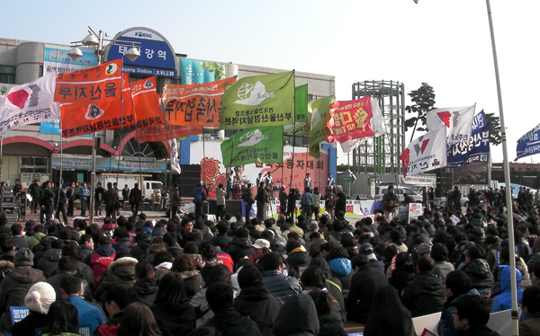 ÅÂȰ¿ª(±¸ ¿ï»ê¿ª) ¾Õ¿¡¼ °³ÃֵƴÙ. Çö´ëÀÚµ¿Â÷ ¿ï»ê°øÀå Á¤±ÔÁ÷ ³ëµ¿ÀÚµéÀº À̳¯ ºñÁ¤±ÔÁ÷ ¹®Á¦ ÇØ°áÀ» À§ÇÑ »çÃøÀÇ ±³¼·À» Ã˱¸Çϸç 2½Ã°£
