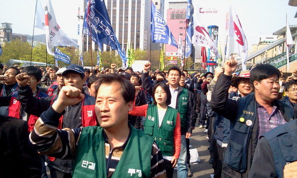 ÅõÀïÀ» ÁöÁö ¾öÈ£Çϱâ À§ÇØ ºÎ»ê¿¡¼ ¿·È°í ¹ÎÁÖ³ëÃÑ Á¶ÇÕ¿ø 3000¿©¸íÀÌ Âü¿©Çß´Ù.