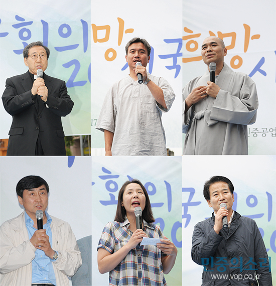 ÇÔ¼¼¿õ ½ÅºÎ(¹ÎÁÖÈ­¿îµ¿±â³ä»ç¾÷ȸ ÀÌ»çÀå), ÅðÈÞ ½º´Ô(½ÇõºÒ±³Àü±¹½Â°¡È¸ ´ëÇ¥), ±è»ó±Ù ¸ñ»ç(6.15³²ÃøÀ§ »óÀÓ´ëÇ¥), Á¤µ¿¿µ ¹ÎÁÖ´ç ÀÇ¿ø µî °¢°è Àλç 200¿© ¸í°ú ºÎ»ê½Ã¹Î µî 400¿© ¸íÀº À̳¯ ¿ÀÈÄ 5½Ã ÇÑÁøÁß°ø¾÷ ¿µµµÁ¶¼±¼Ò 85È£ Å©·¹ÀÎ ¸ÂÀºÆí¿¡¼­ ¡®»ý¸í, ÆòÈ­ ±×¸®°í ¼ÒÅëÀ» À§ÇÑ Èñ¸Á½Ã±¹È¸ÀÇ¡¯¸¦ ¿­°í ¡®½Ã±¹¼±¾ð¡¯À» ¹ßÇ¥Çß´Ù.
