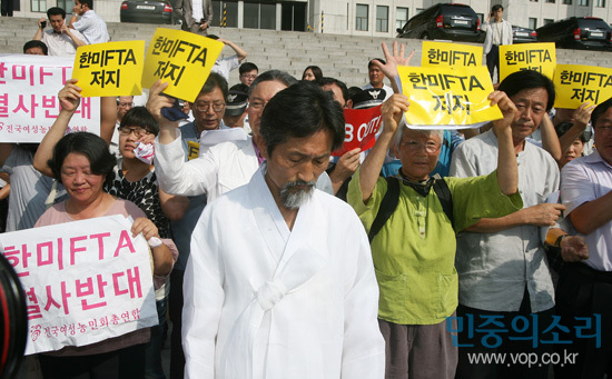 À̱¤¼® Àü±¹³ó¹ÎȸÀå µî ³ó¹Î ´ëÇ¥ÀÚ 20¿©¸íÀº 31ÀÏ ¿ÀÀü 9½Ã²² ±¹È¸ ¾Õ µ¹°è´Ü¿¡¼ ±âÀÚȸ°ßÀ» ¿°í ¡°ÇÑ¹Ì FTA ¿ÜÅëÀ§ »óÁ¤Àº ³ó¹ÎµéÀ» ´Ù Á×ÀÌ´Â °Í¡±À̶ó¸ç ¡°³ëµ¿ÀÚ, ³ó¹ÎµéÀ» º¶ûÀ¸·Î ³»¸ð´Â ÇÑ¹Ì FTA »óÁ¤À» Áï°¢ öȸÇ϶󡱰í Ã˱¸Çß´Ù.