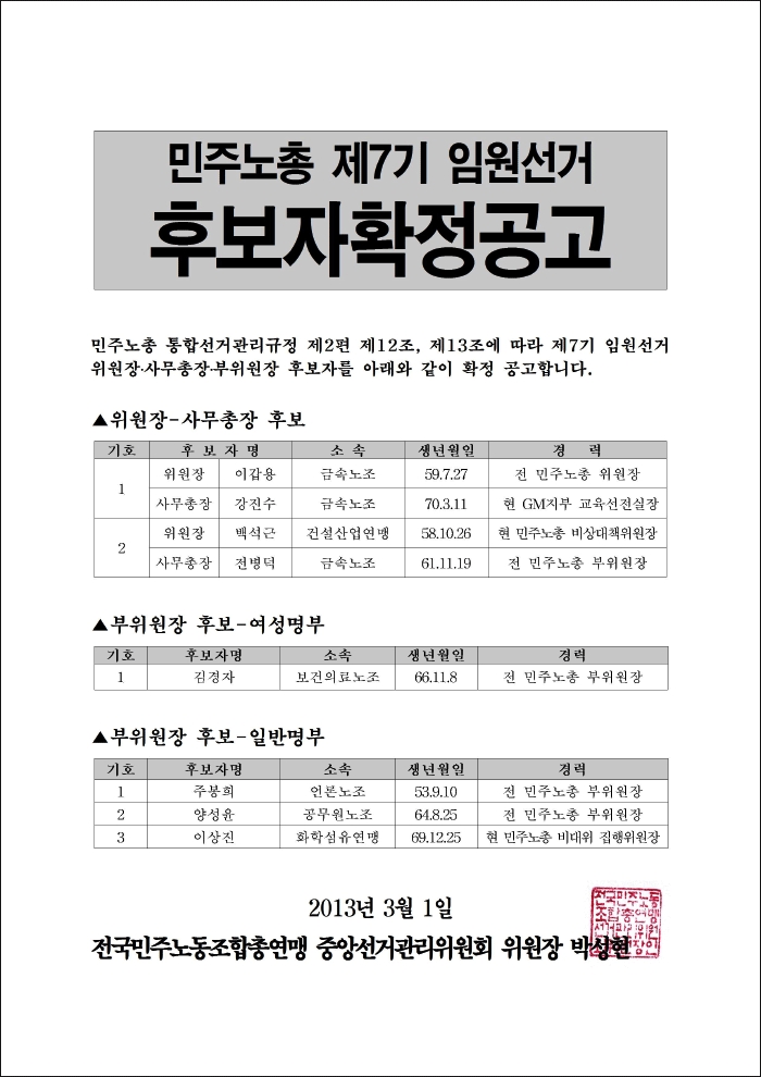 ¼Ò½Ä-¹ÎÁÖ³ëÃÑ Á¦ 7±â ÀÓ¿ø(À§¿øÀå-»ç¹«ÃÑÀå-ºÎÀ§¿øÀå-ȸ°è°¨»ç)¼±°Å ÀÔÈĺ¸ÀÚ µî·Ï È®Á¤ °ø°í.