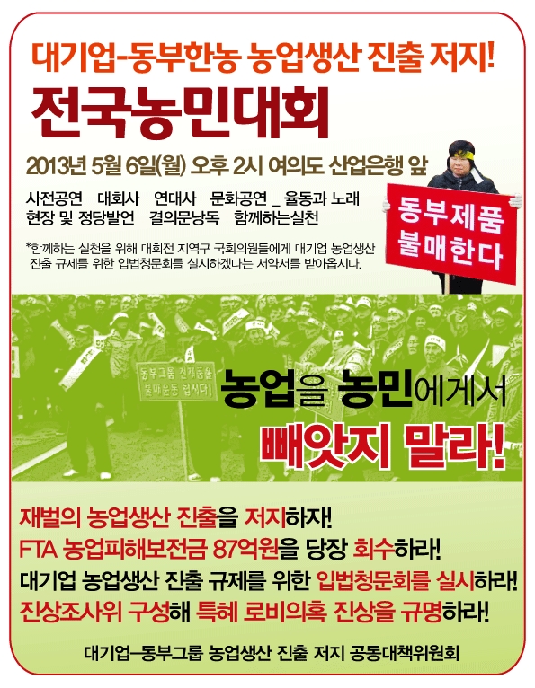 * ´ë±â¾÷ - µ¿ºÎ Çѳó ³ó¾÷ ÁøÃâ ÀúÁö¸¦ À§ÇÑ Àü±¹³ó¹Î´ëȸ / ÀÏ½Ã¹× Àå¼Ò : 2013³â 5¿ù 6ÀÏ(¿ù) ¿ÀÈÄ 2½Ã~. ¼¿ï ¿©Àǵµ »ê¾÷ÀºÇà ¾Õ / Àü±¹ÀÇ ³ó¹ÎµéÀÌ ¼¿ï¿¡ ¸ð¿© ´ë±â¾÷ ³ó¾÷ÁøÃâ ÀúÁö¸¦ À§ÇÑ °øµ¿ Çൿ¿¡ ³ª¼°í, °¢ Áö¿ª ±¹È¸ÀÇ¿øµéÀ» ´ë»óÀ¸·Î ´ë±â¾÷ ³ó¾÷ÁøÃâ ±ÝÁö¸¦ °ñÀÚ·Î ÇÑ Á¦µµÈ ½ÇÇö ¾à¼ÓÀ» ¹Þ¾Æ³»´Â °ÉÀ½À» ³»µó½À´Ï´Ù. / °¢ Áö¿ªÇöÀå¿¡¼ÀÇ Àû±ØÀûÀÎ Áö¿ø°ú ´çÀÏ ´ëȸ Àû±ØÀûÀÎ Âü¼®À» Èñ¸ÁÇÕ´Ï´Ù.