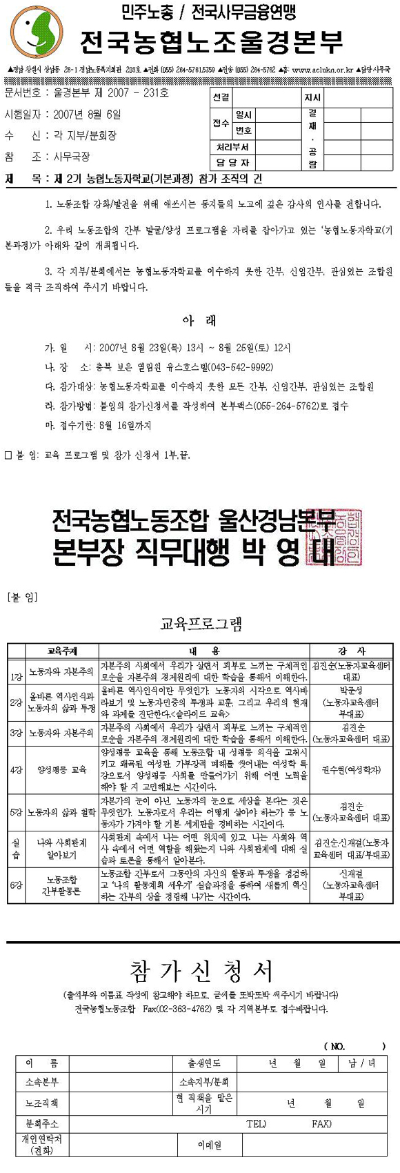 [°ø¹®07-231] Á¦2±â ³óÇù³ëµ¿ÀÚÇб³ Á¶Á÷ÀÇ °Ç