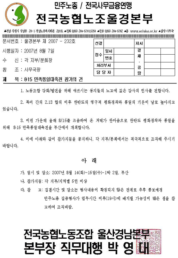 [°ø¹®07-232] 8.15 ¹ÎÁ·ÅëÀÏ´ëÃàÀü Âü°¡ÀÇ °Ç
