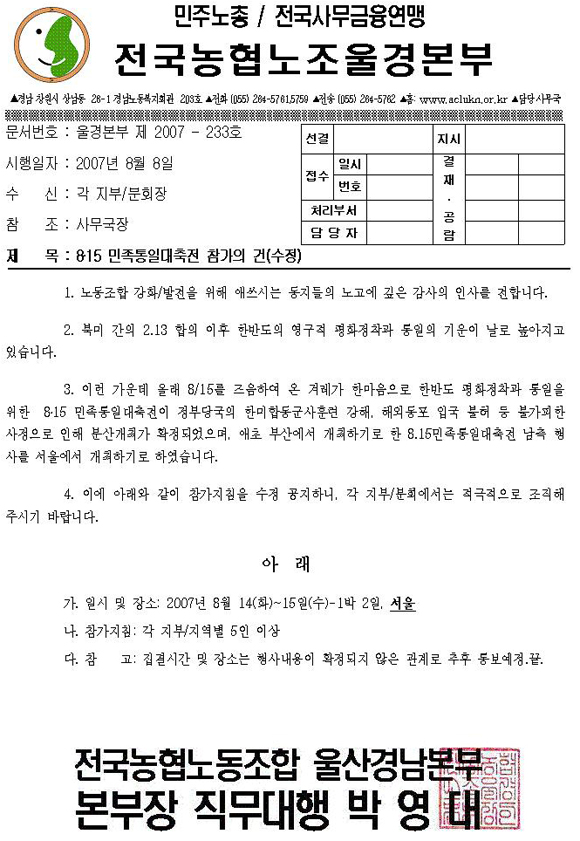 [°ø¹®07-233] 8.15 ¹ÎÁ·ÅëÀÏ´ëÃàÀü Âü°¡ÀÇ °Ç(¼öÁ¤)