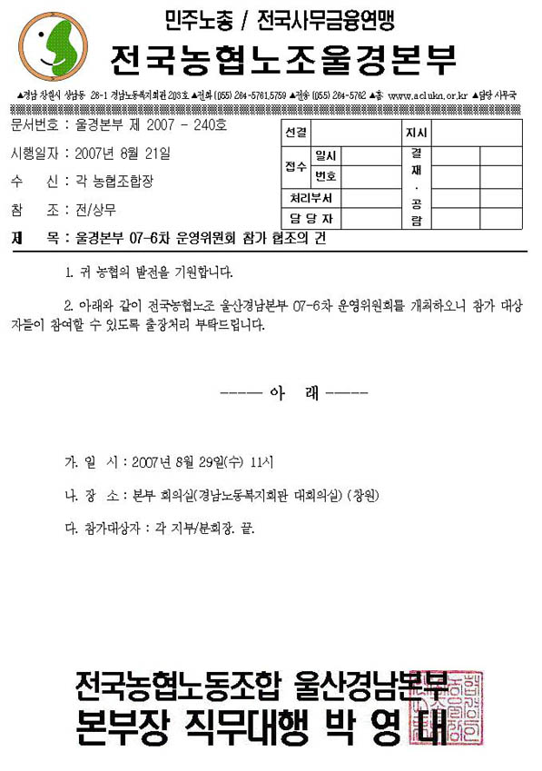 [ÀϹÝ] [°ø¹®-240] º»ºÎ 07-6Â÷ ¿î¿µÀ§¿øÈ¸ Âü°¡ ÇùÁ¶ÀÇ °Ç
