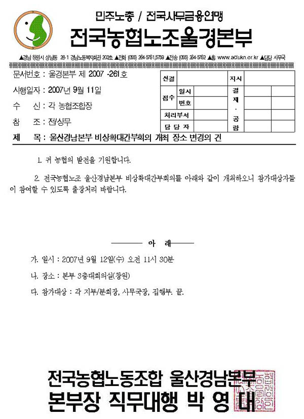 Àü±¹³óÇù³ëÁ¶ ¿ï»ê°æ³²º»ºÎ ȨÆäÀÌÁö´Â Á¤º¸¸¦ ³ª´¯´Ï´Ù. º°µµÀÇ Ç¥½Ã°¡ ¾ø´Â ÇÑ ÀúÀÛ¹°Àº 'Á¤º¸°øÀ¯¶óÀ̼±½º 2.0 : ¿µ¸®±ÝÁö'¸¦ µû¸¨´Ï´Ù.