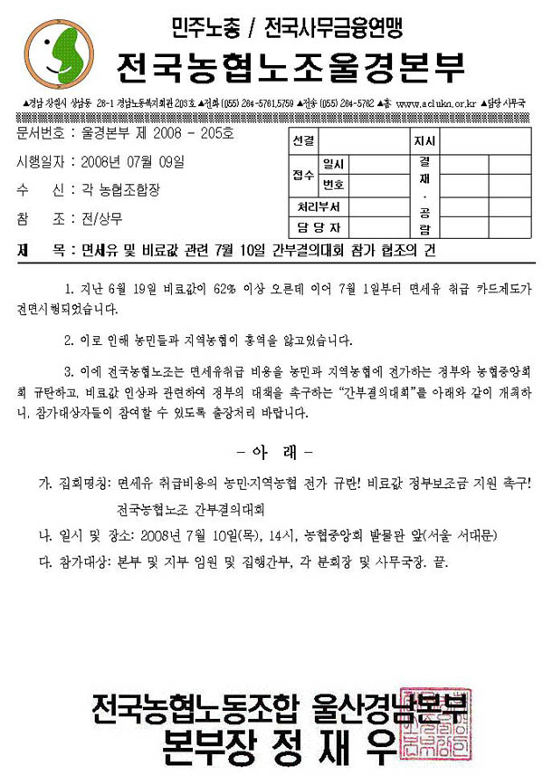 Àü±¹³óÇù³ëÁ¶ ¿ï»ê°æ³²º»ºÎ ȨÆäÀÌÁö´Â Á¤º¸¸¦ ³ª´¯´Ï´Ù. º°µµÀÇ Ç¥½Ã°¡ ¾ø´Â ÇÑ ÀúÀÛ¹°Àº 'Á¤º¸°øÀ¯¶óÀ̼±½º 2.0 : ¿µ¸®±ÝÁö'¸¦ µû¸¨´Ï´Ù.