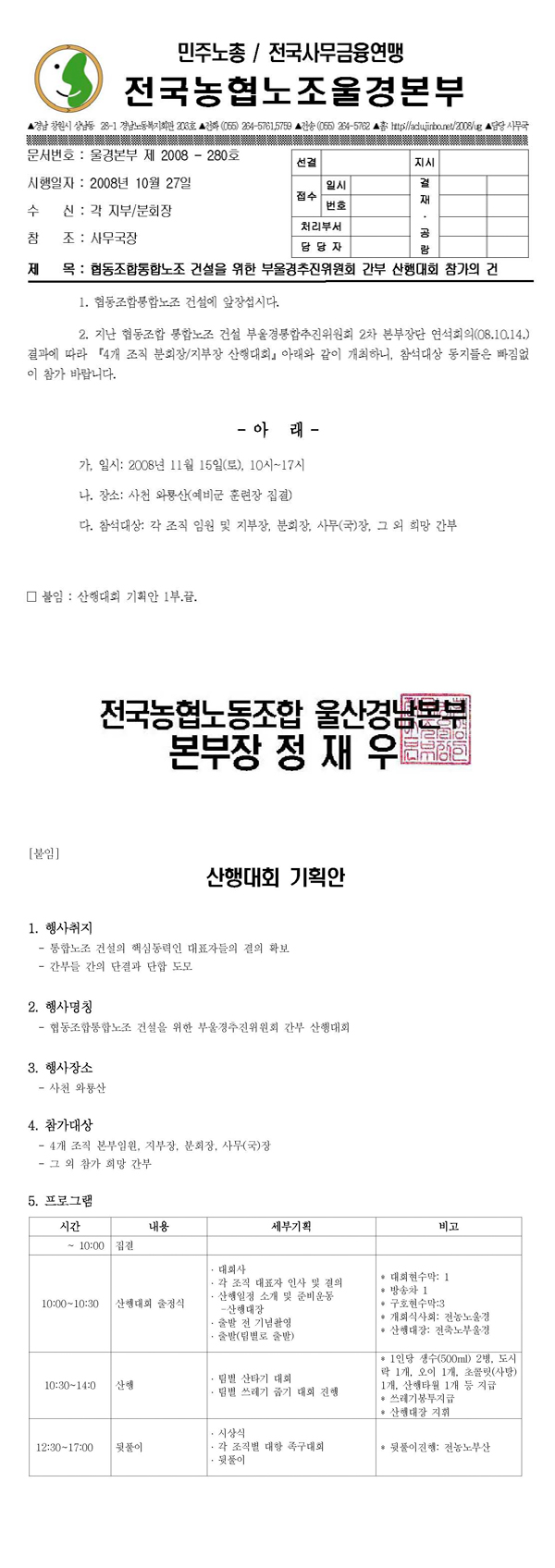 [°ø¹®] 08-280 Çùµ¿Á¶ÇÕÅëÇÕ³ëÁ¶ °Ç¼³ °£ºÎ »êÇà´ëȸ Âü°¡ÀÇ °Ç