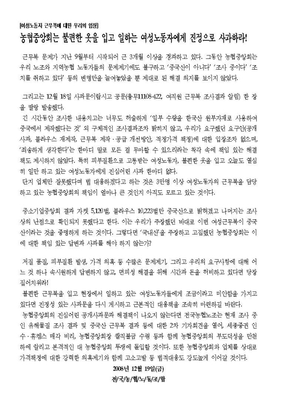 ³óÇùÁß¾Óȸ´Â ºÒÆíÇÑ ¿ÊÀ» ÀÔ°í ÀÏÇÏ´Â ¿©¼º³ëµ¿ÀÚ¿¡°Ô ÁøÁ¤À¸·Î »ç°úÇ϶ó!