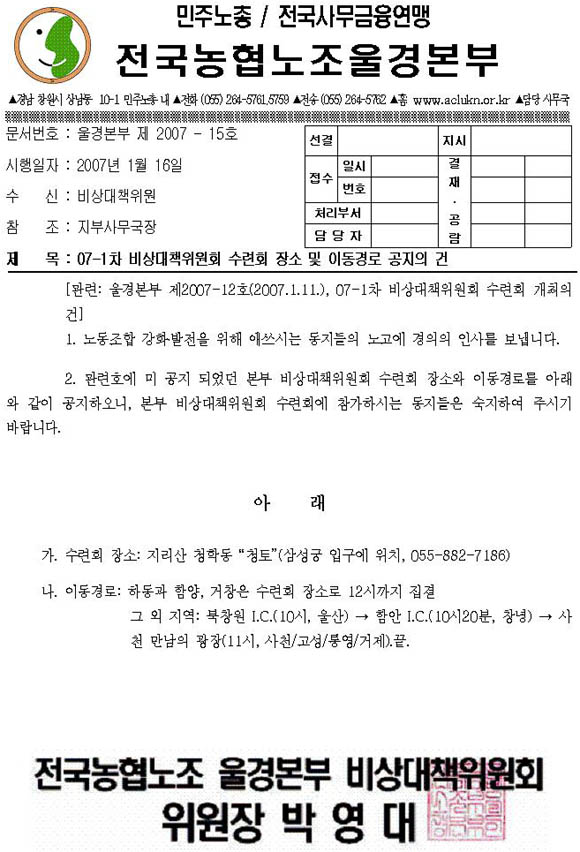 [°ø¹® 07-15]º»ºÎ 07-1Â÷ ºñ»ó´ëÃ¥À§¿øÈ¸ ¼ö·Ãȸ Àå¼Ò ¹× À̵¿°æ·Î °øÁöÀÇ °Ç