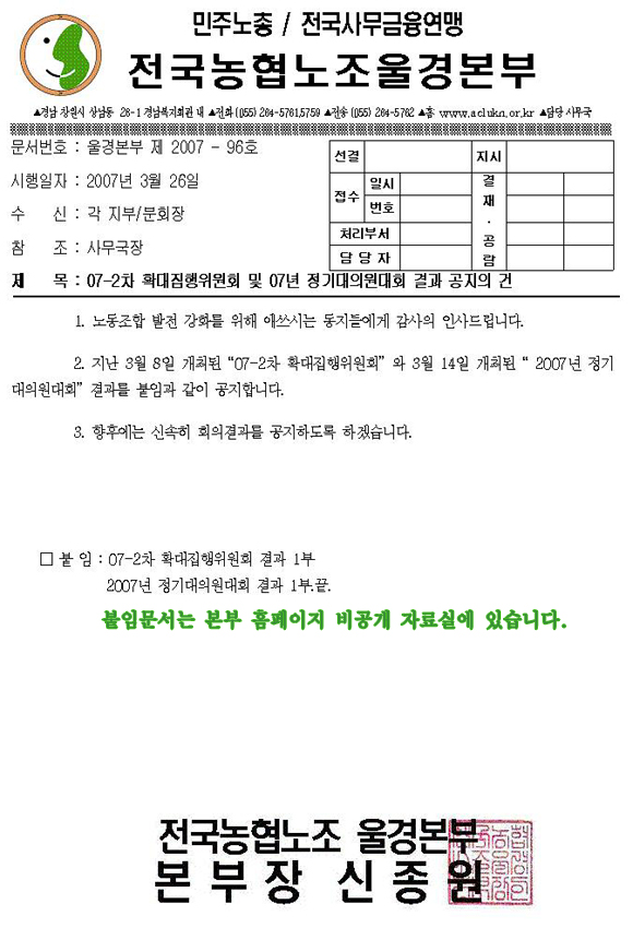 [°ø¹® 07-96] 07-2Â÷ È®´ëÁýÇàÀ§¿øÈ¸ ¹× Á¤±â´ëÀÇ¿ø´ëȸ °á°ú °øÁöÀÇ °Ç