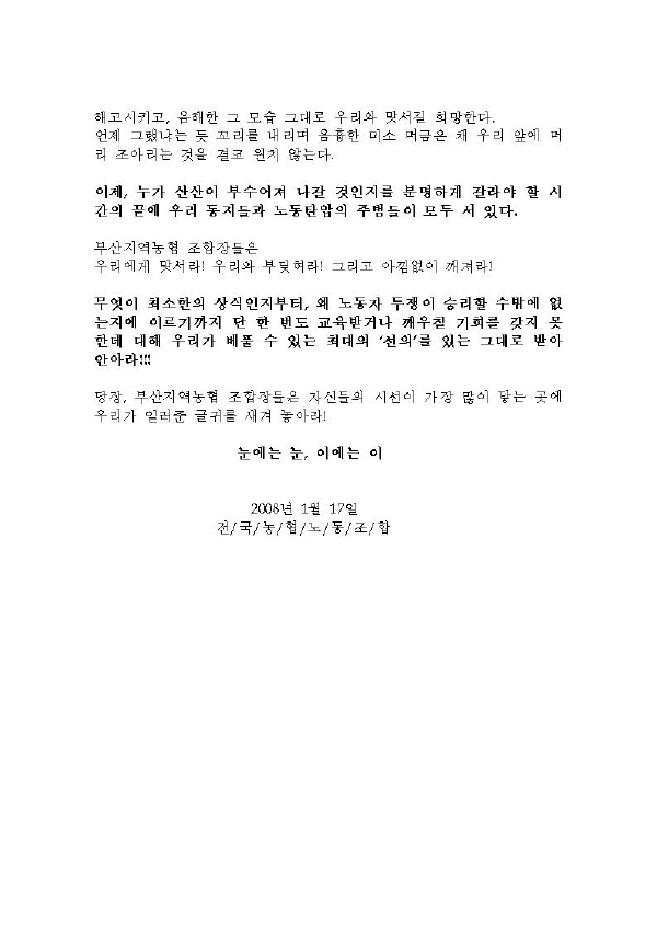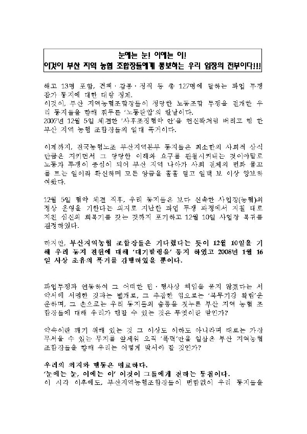 ÇÏÁö¸¸, ºÎ»êÁö¿ª³óÇù Á¶ÇÕÀåµéÀº ±â´Ù·È´Ù´Â µíÀÌ 12¿ù 10ÀÏÀ» ±âÇØ ¿ì¸® µ¿Áö Àü¿ø¿¡ ´ëÇØ ¡®´ë±â¹ß·ÉÀ»¡¯ ÅëÁö ÇÏ¿´°í 2008³â 1¿ù 16ÀÏ »ç»ó ÃÊÀ¯ÀÇ Æø°Å¸¦ °¨ÇàÇÏ¿´À» »ÓÀÌ´Ù.